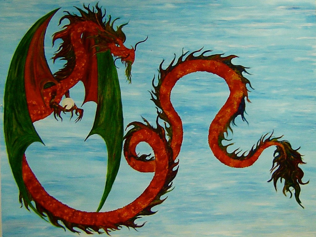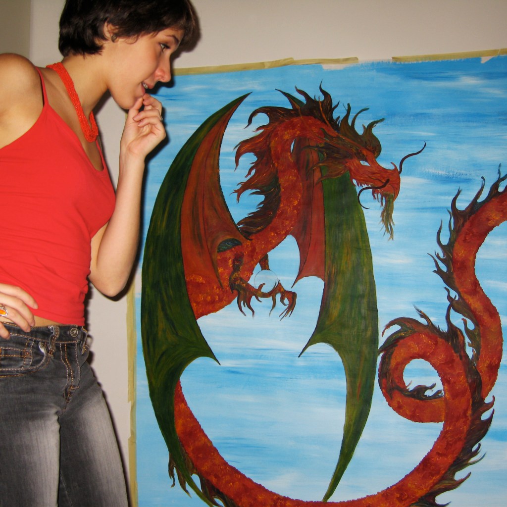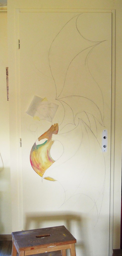 J’ai pu accrocher une feuille de 1 mètre 50 de haut sur 2 mètres de large sur le mur d’Agnès, la mère d’un ami. Et pendant plusieurs semaines, j’ai peint un grand dragon rouge, avec dans sa queue, les symboles de l’alpha et de l’oméga (début et fin de toute chose).