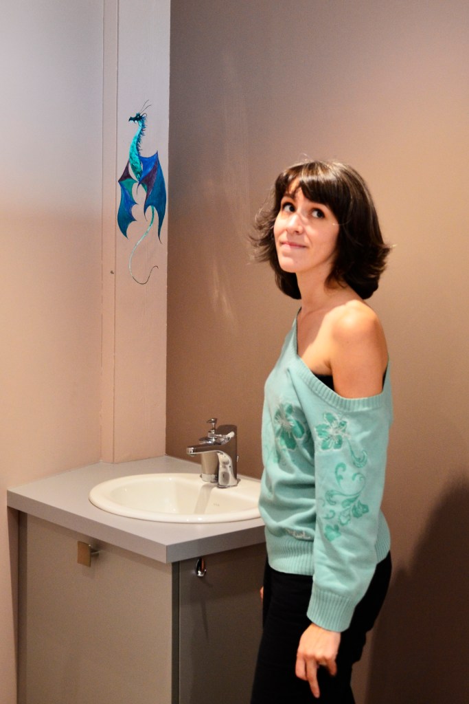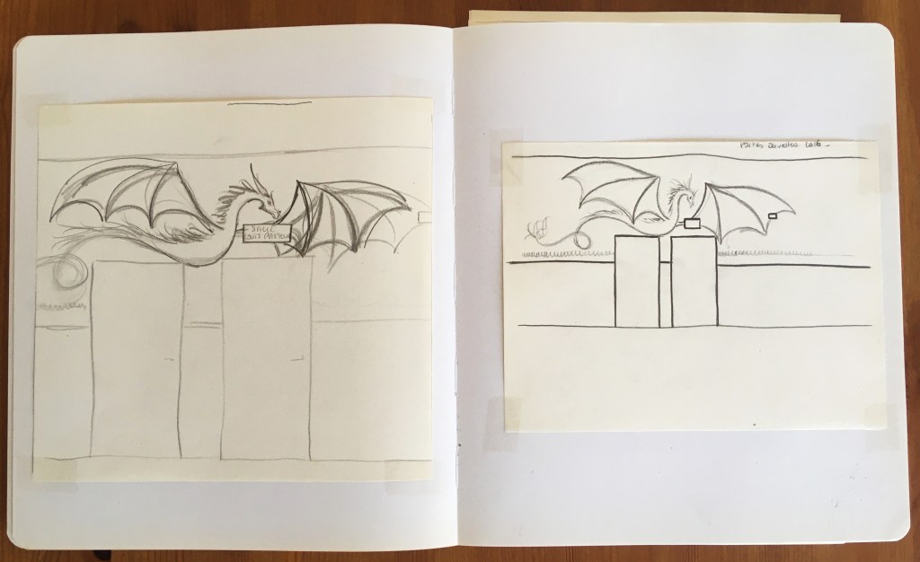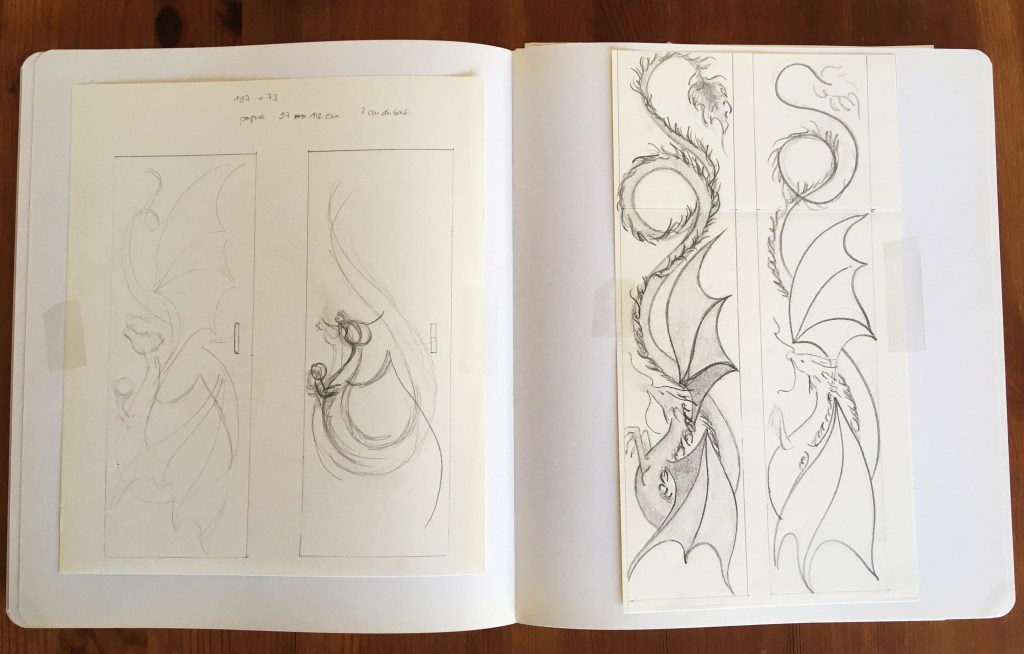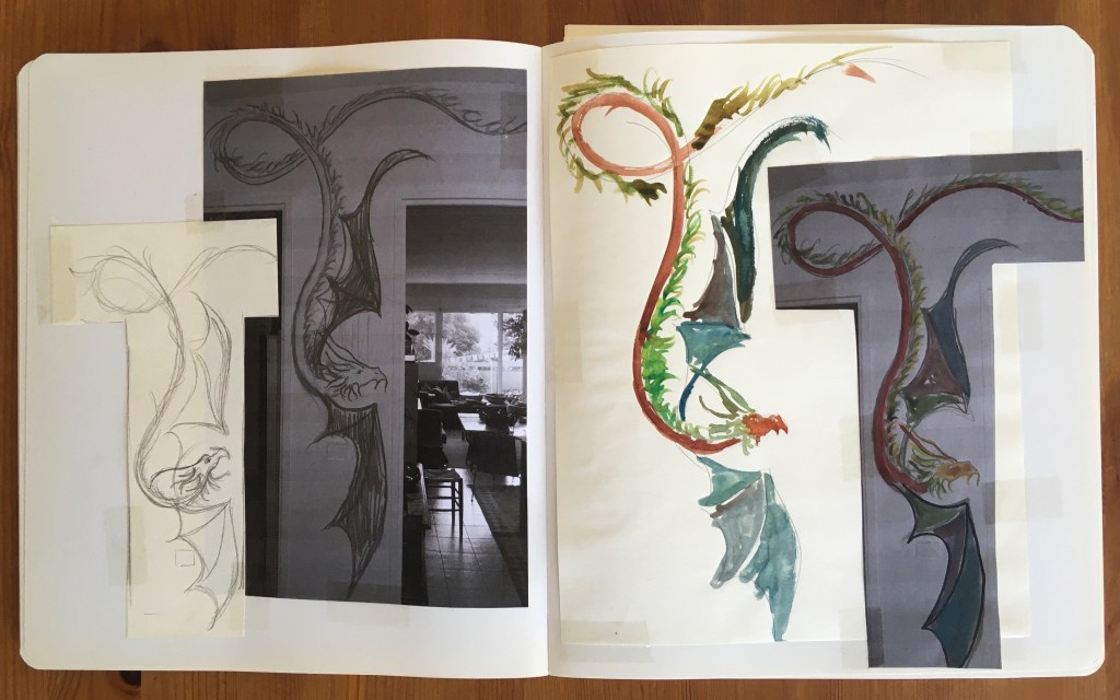 Je commence toujours par prendre les mesures du mur qui va porter mon dragon pour pouvoir faire un dessin à l’échelle. Puis viennent les recherches, croquis, esquisses avant de trouver la forme parfaite qui va adopter les lignes de son environnement.