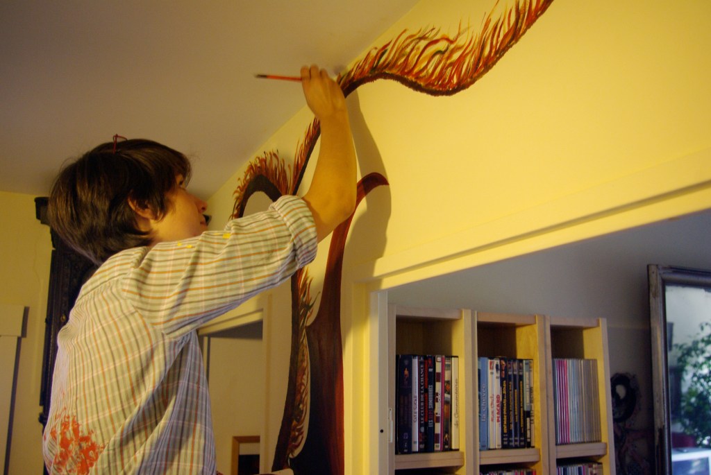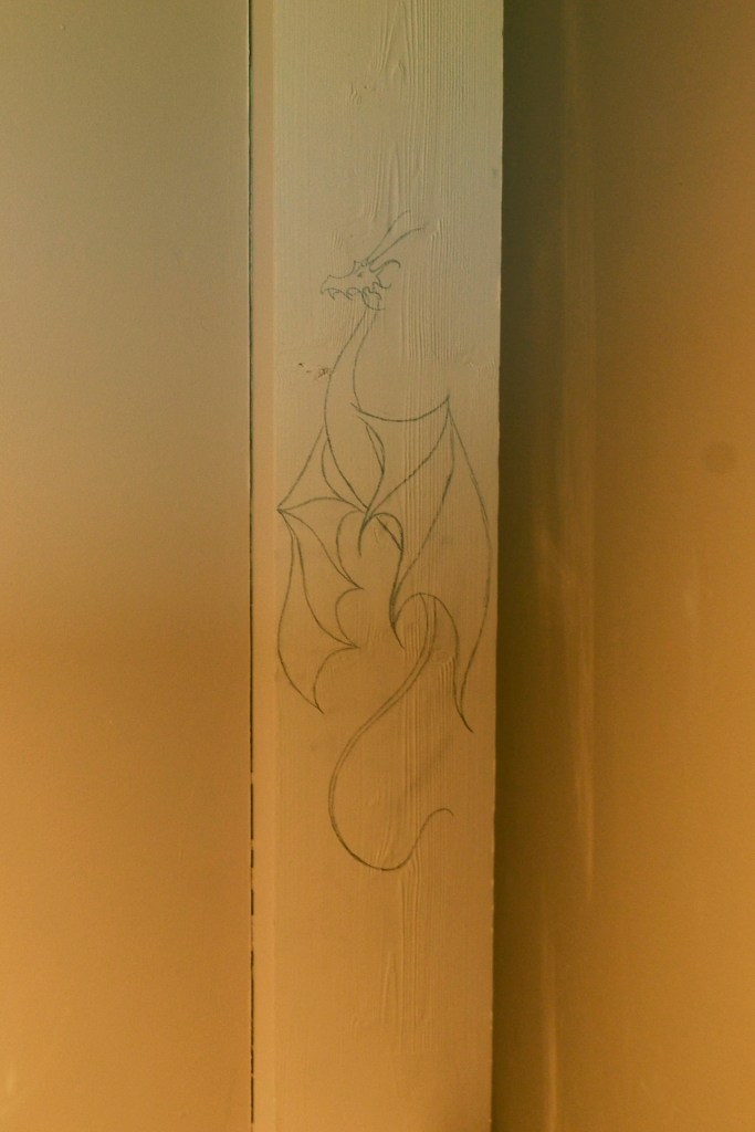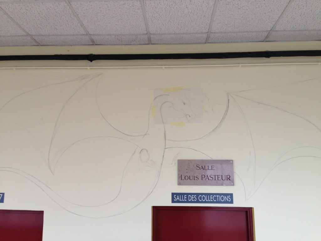 Une fois validé cette ébauche avec le commanditaire, je commence au crayon à papier directement sur le mur. Les lignes doivent être pures, élancées, je dois ressentir le dragon dans mon propre corps.