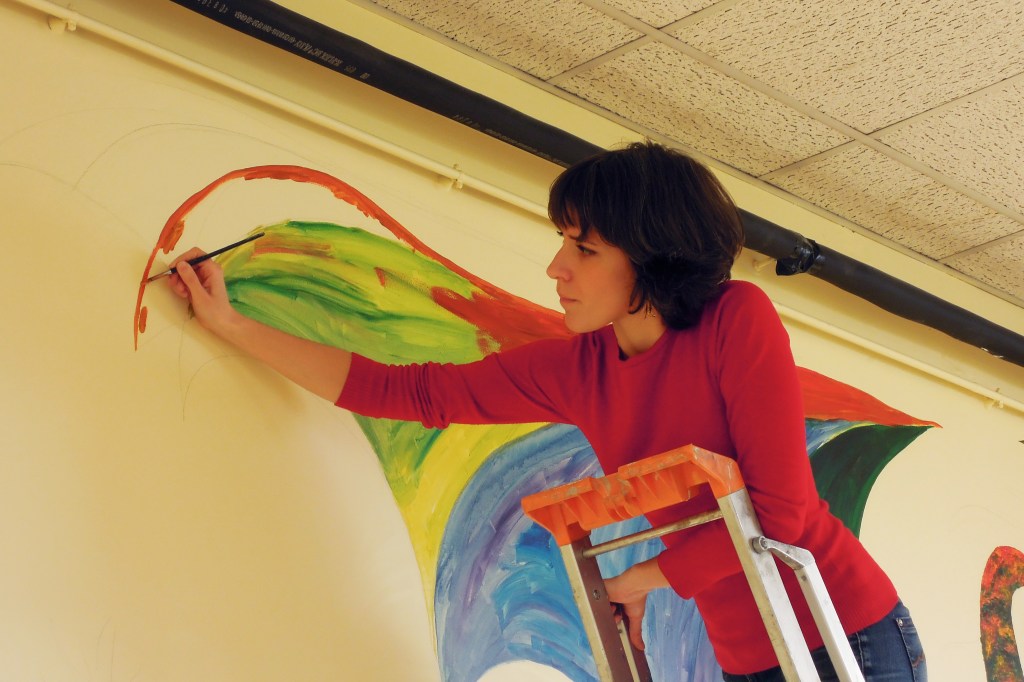 Ensuite, je peins une première couche colorée, un peu délavée, pour remplir les aspérités du mur afin de ne plus avoir de problèmes lors de la couche définitive.