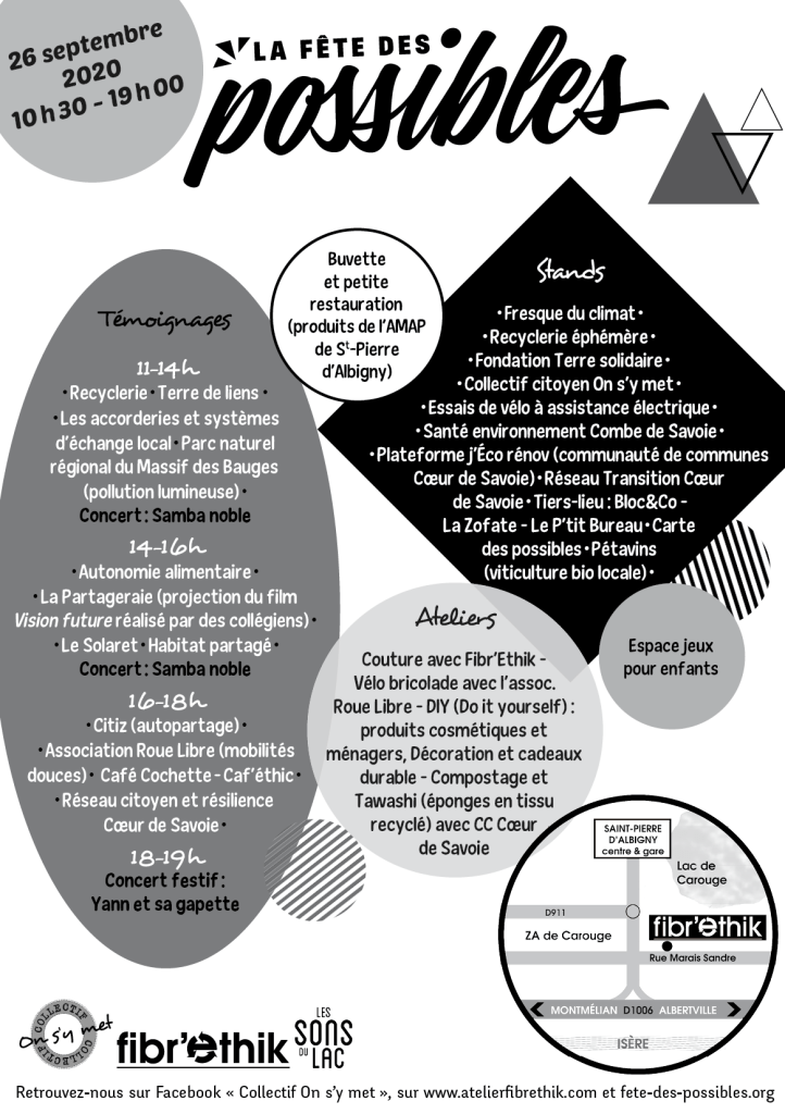 Le mois de septembre arrive et avec lui l’organisation de la Fête des Possibles. Notre évènement va avoir lieu dans les locaux de Fibr’Ethik, une association implantée sur la commune de Saint-Pierre d’Albigny, et je dois donc travailler en plus étroite collaboration avec leur chargée de communication, Lucile Galtié. C’est une belle rencontre que je fais, et nous serons amenées à travailler ensemble pendant plus d’un an par la suite, tout en développant une belle amitié !