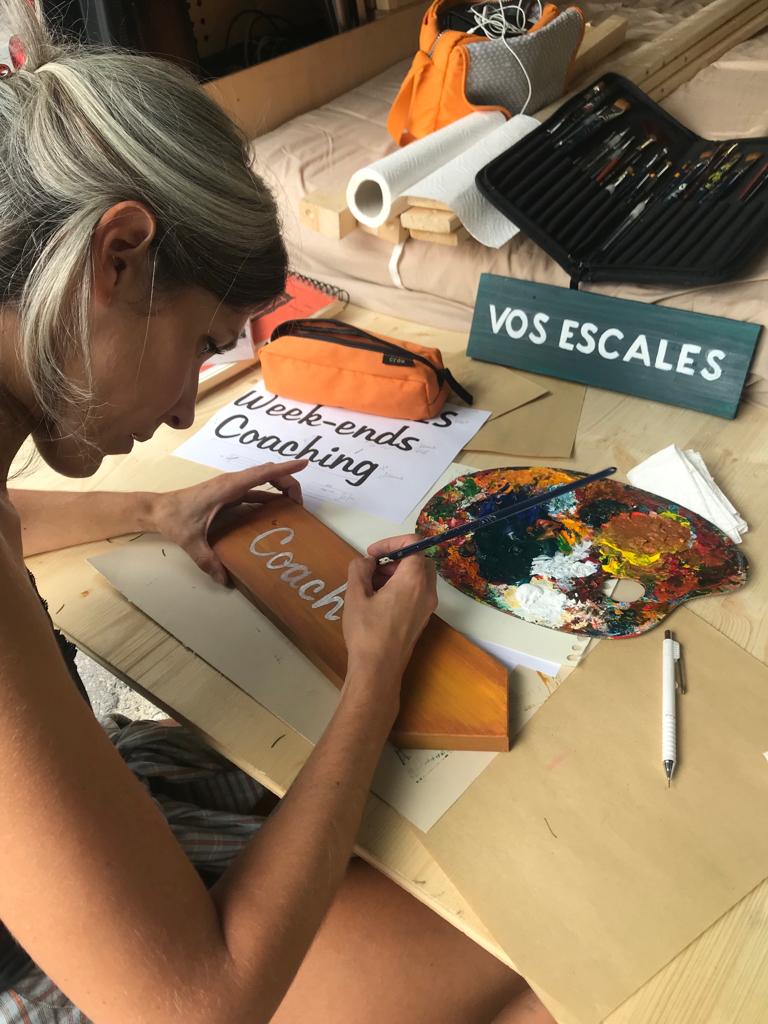 Quelques éléments de signalétiques peints à la main en gardant les polices de caractères de la charte graphique de Une Escale en Vous.