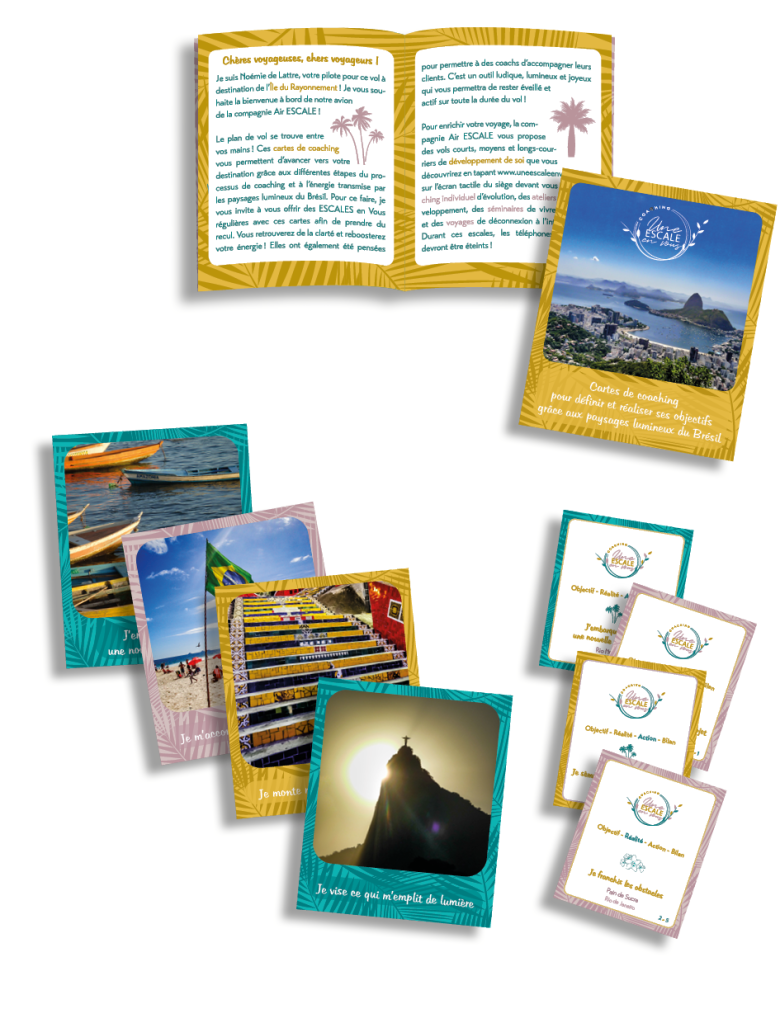 Nous avons travaillé avec soin, tant sur les cartes que sur le livret d’accompagnement. Noémie disposait déjà d’une charte graphique, que nous avons légèrement retravaillée — notamment un rose un peu trop pâle, difficile à lire sur fond blanc. Pour sublimer le dos des cartes, je me suis inspirée de l’univers tropical, en lien avec les photos du Brésil.